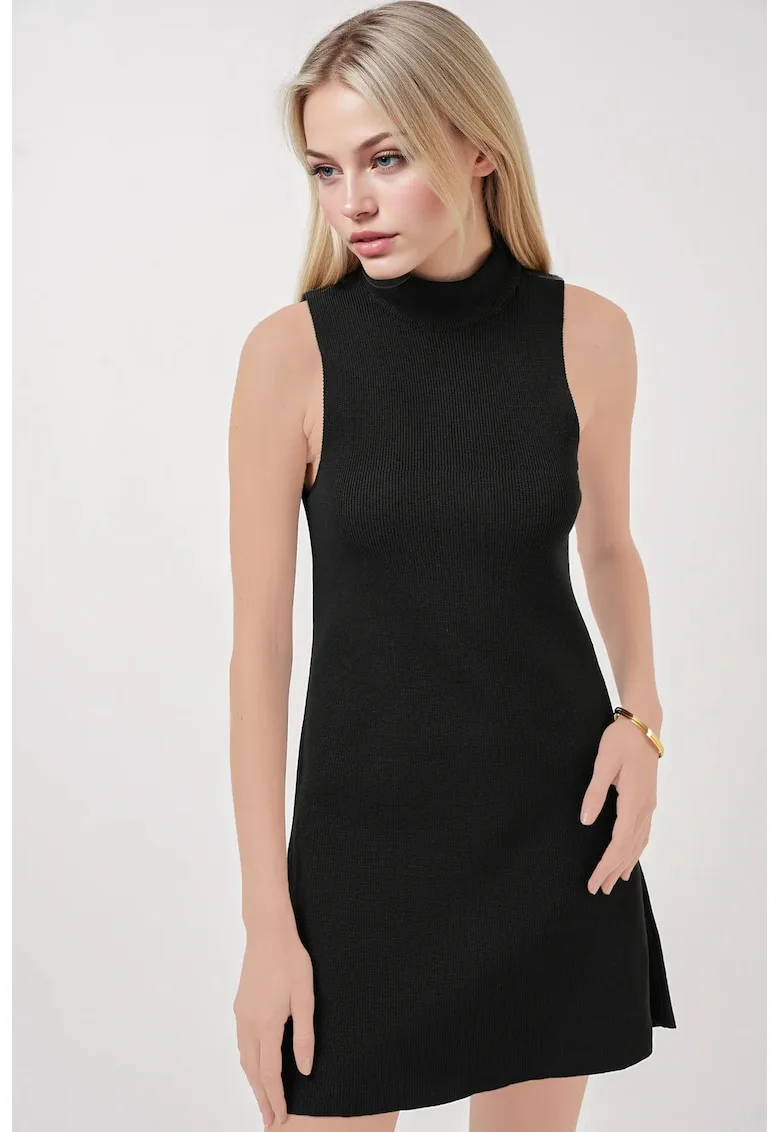 Rochie mini tricotata cu nervuri – guler inalt – Negru – tricot – – Reduceri Exclusive