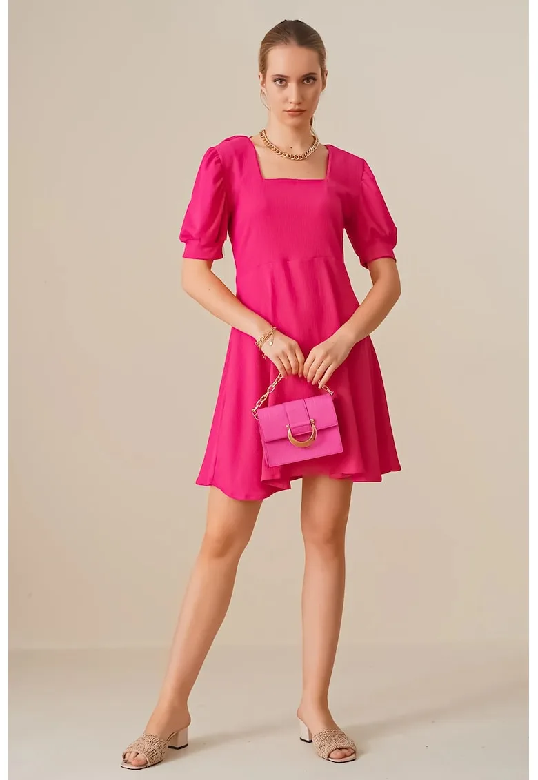 Rochie mini tricotata guler patrat – roz – jerseu – Reduceri Exclusive