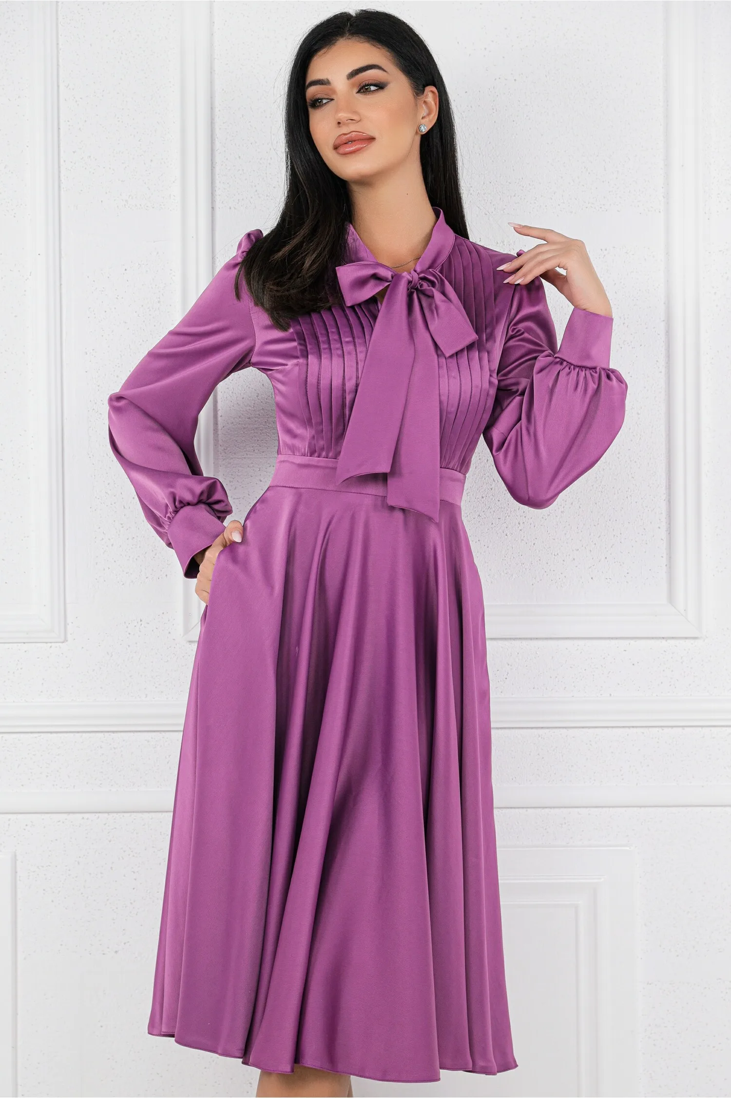Rochie mov din satin cu pliuri pe bust si buzunare functionale