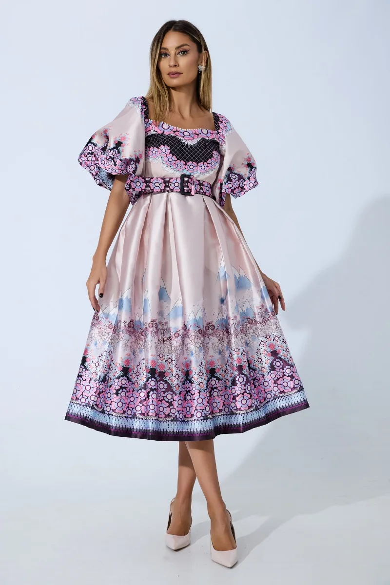 Pentru o aparitie ravasitoare si momente de neuitat, ai nevoie de o rochie care sa iti evidentieze feminitatea. Creata din tafta cu imprimeu, Rochia Natasha Rose din Colectia de Rochii de Lux se potriveste perfect siluetei tale. Ampla in partea inferioara, avand talia marcata de cordon rochia iti va asigura o aparitie cel putin spectaculoasa! material neelastic buzunare laterale maneci scurte bufante curea in talie fara jupon Dimensiuni disponibile: S, M, L, XL