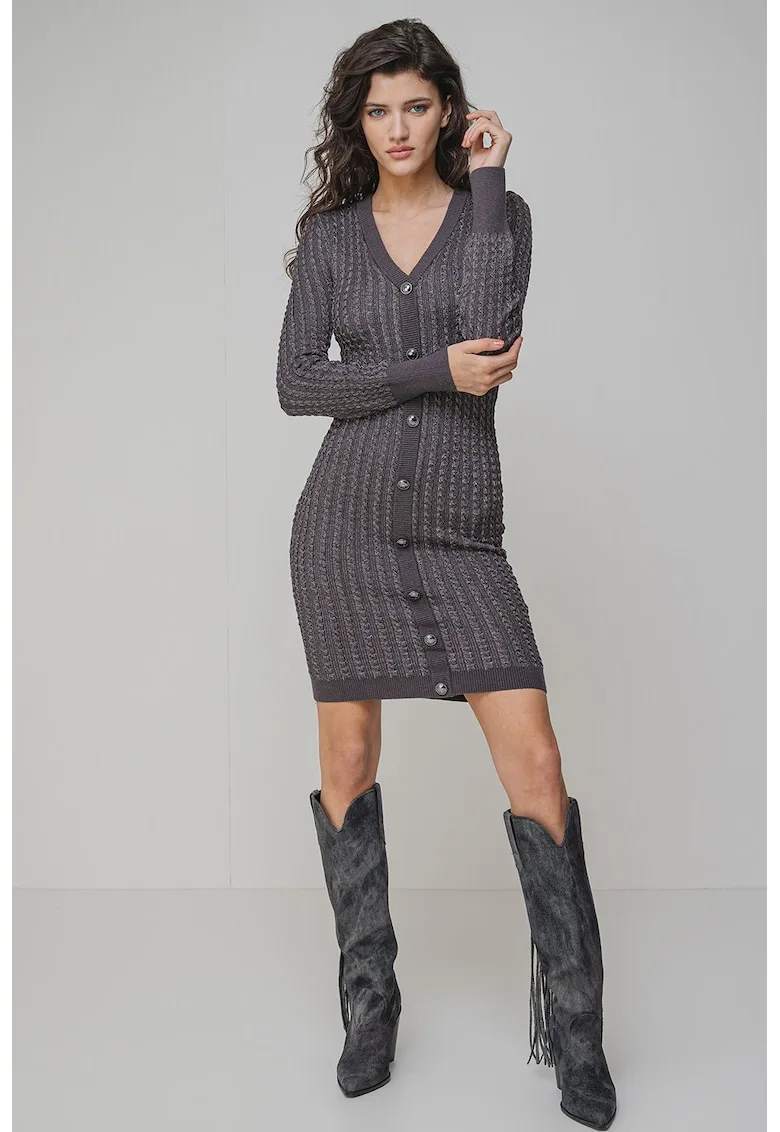 Caracteristici Culoare: gri inchis Stil: casual Material: tricot Imprimeu: uni Croiala: bodycon Lungime: scurta Decolteu: in v Lungime maneca: maneca lunga Detalii: nasturi decorativi – fire stralucitoare – design cu torsade Sistem inchidere: fara inchidere Compozitie Exterior: 65% viscoza – 16% fibre metalice – 12% poliester – 7% poliamida Info model Modelul poarta un produs de marimea S. Marimi model: 175 cm inaltime – 84 cm bust – 62 cm talie – 90 cm sold.