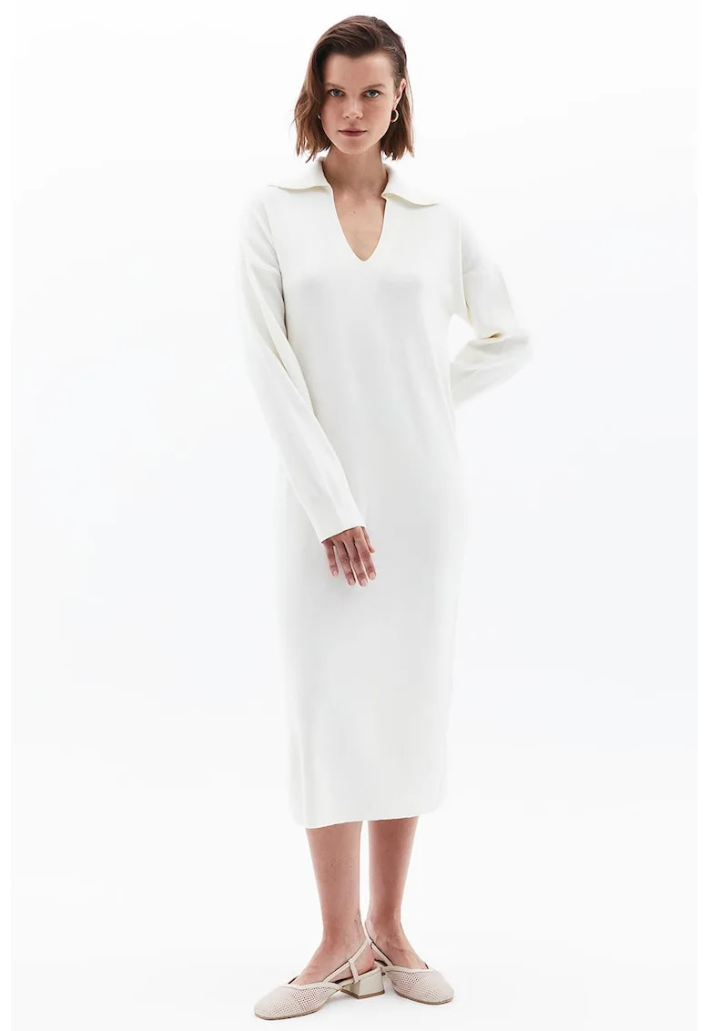 Caracteristici Culoare: crem Stil: casual Material: sintetic – viscoza – tricot Imprimeu: uni Croiala: dreapta Lungime: midi Decolteu: in v Guler: polo Lungime maneca: maneca lunga Sistem inchidere: fara inchidere Compozitie Exterior: 51% viscoza – 26% poliester – 23% poliamida.