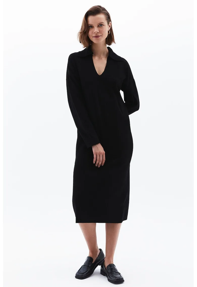 Caracteristici Culoare: negru Stil: casual Material: sintetic – viscoza – tricot Imprimeu: uni Croiala: dreapta Lungime: midi Decolteu: in v Guler: polo Lungime maneca: maneca lunga Sistem inchidere: fara inchidere Compozitie Exterior: 51% viscoza – 26% poliester – 23% poliamida.