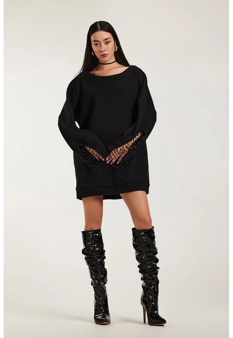 Caracteristici Culoare: negru Stil: casual Material: bumbac Imprimeu: uni Croiala: dreapta Lungime: scurta Decolteu: rotund Maneci: cazute Lungime maneca: maneca lunga Detalii: aplicatii din strasuri Compozitie Exterior: 100% bumbac.