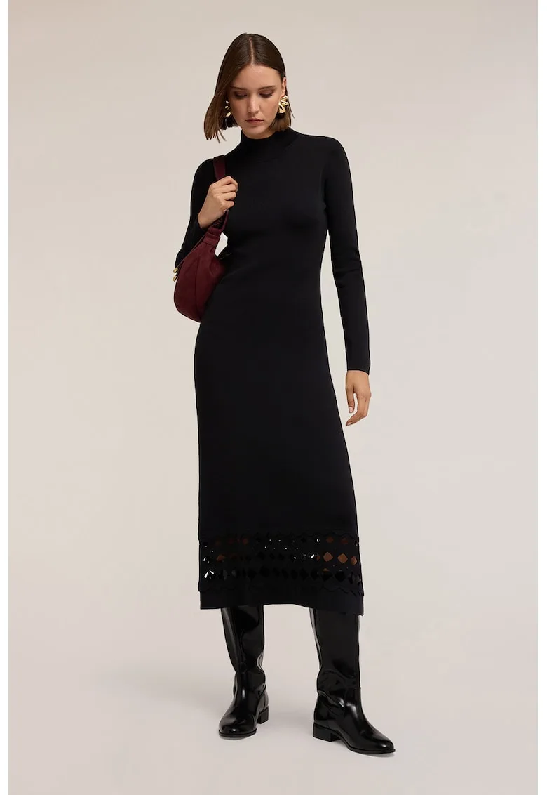 Caracteristici Culoare: negru Stil: casual Material: sintetic – viscoza – tricot Imprimeu: uni Croiala: in a Lungime: midi Decolteu: la baza gatului Lungime maneca: maneca lunga Detalii: decupaje decorative Sistem inchidere: fara inchidere Compozitie Exterior: 57% viscoza – 30% poliamida – 13% poliester.