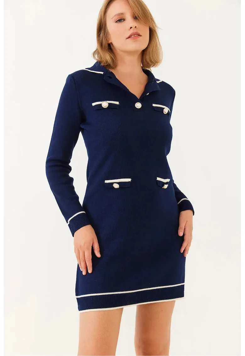 Rochie tricotata – nervuri – guler camasa – albastra – tricot – – Reduceri Exclusive