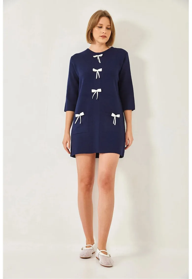 Rochie tricotata – texturata cu funda – albastra – tricot – – Reduceri Exclusive