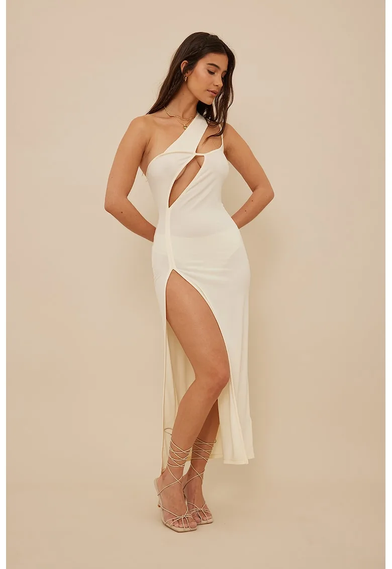 Caracteristici Culoare: alb murdar Stil: casual Material: sintetic Imprimeu: uni Croiala: decolteu pe un umar Lungime: lunga Lungime maneca: fara maneca Detalii: decupaje Sistem inchidere: fara inchidere Compozitie Exterior: 95% poliester – 5% elastan.