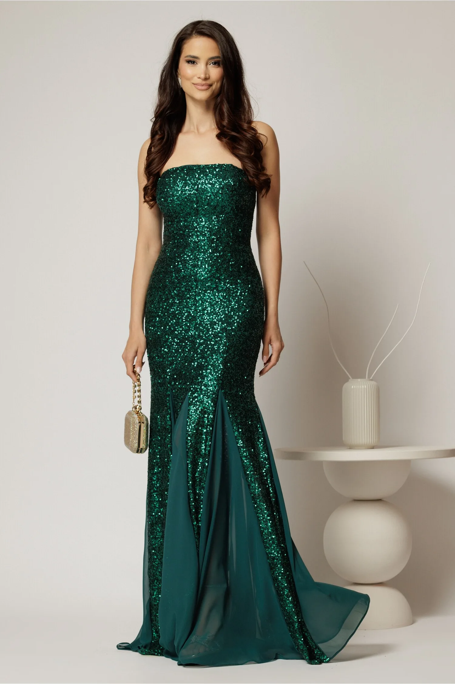 Rochie verde lunga de seara din paiete cu bretele subtiri si insertii de voal pe fusta – Reduceri Exclusive