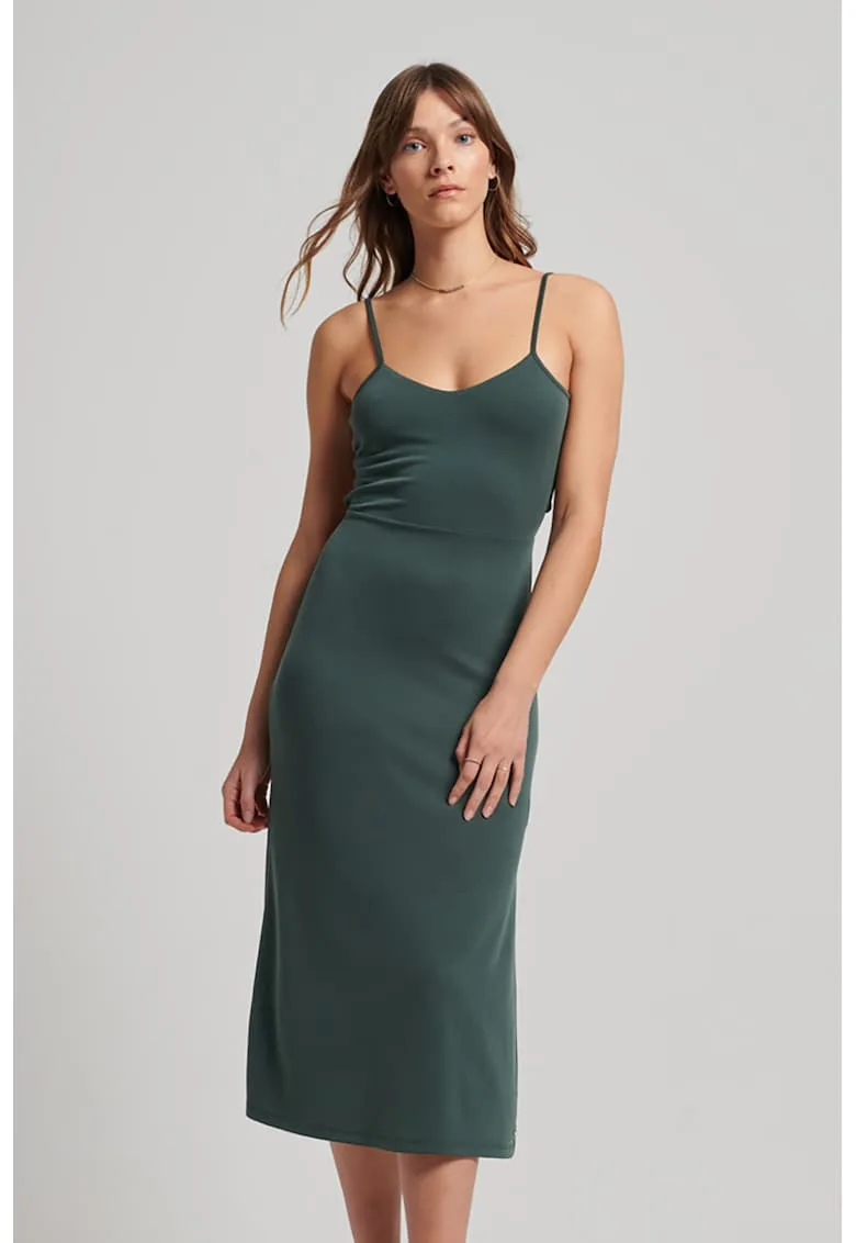 Caracteristici Culoare: verde padure Stil: casual Material: poliester – modal Imprimeu: uni Croiala: dreapta Lungime: midi Decolteu: in v Barete: ajustabile – inguste Lungime maneca: fara maneca Detalii: design funda Sistem inchidere: fara inchidere Compozitie Exterior: 68% modal – 32% poliester.